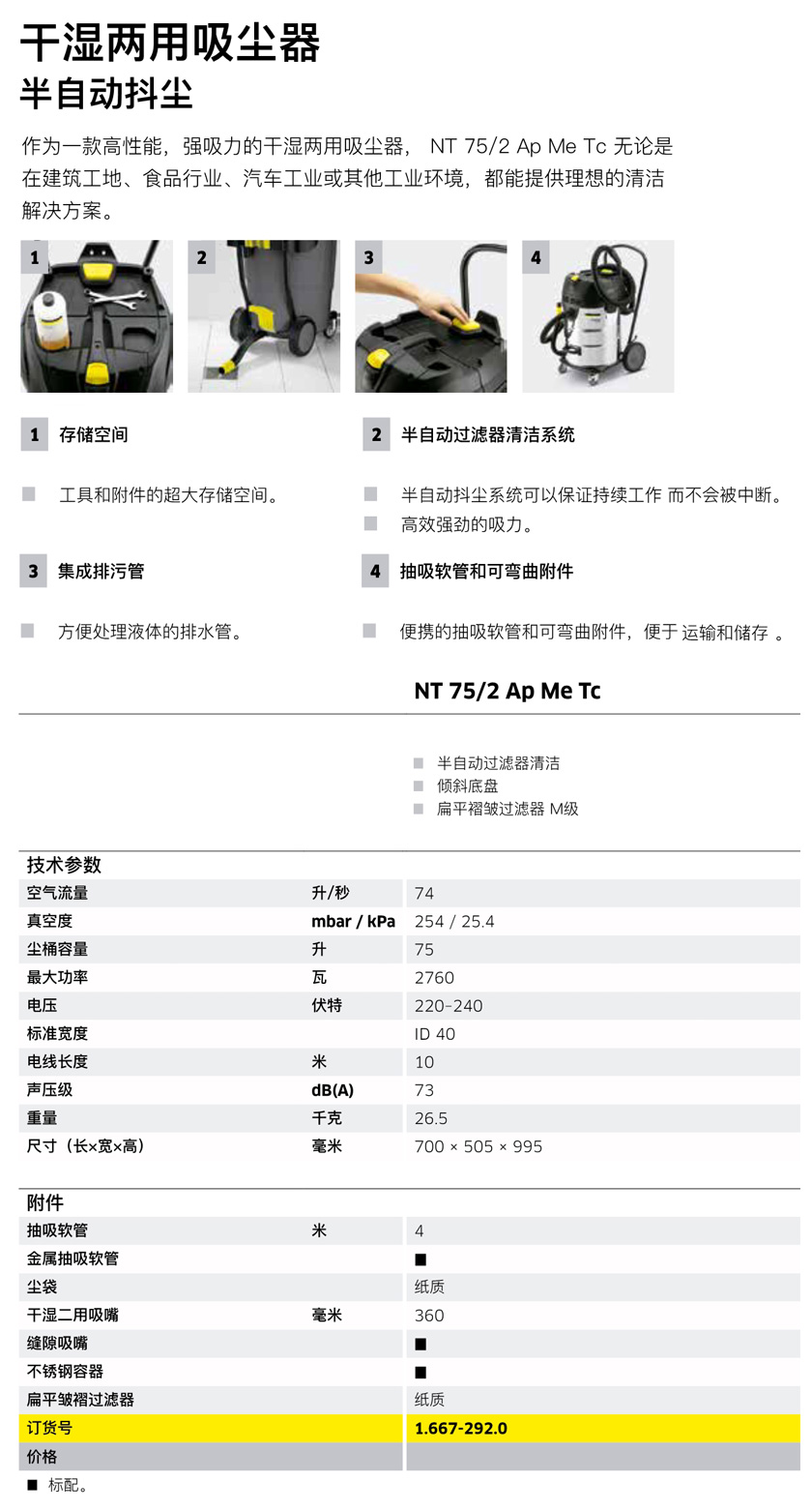 NT 75/2 Ap Me Tc 還設(shè)有監(jiān)測系統(tǒng)以確保濕塵的量不要超過限量。通過耐油排水管,液體可以容易地被掏空。配件可以快速連接到吸塵器并方便使用。設(shè)備自帶的超大儲(chǔ)物箱可用于存放工具和附件。兩個(gè)輪子和兩個(gè)滾輪給NT 75/2 Ap Me Tc良好的移動(dòng)性。