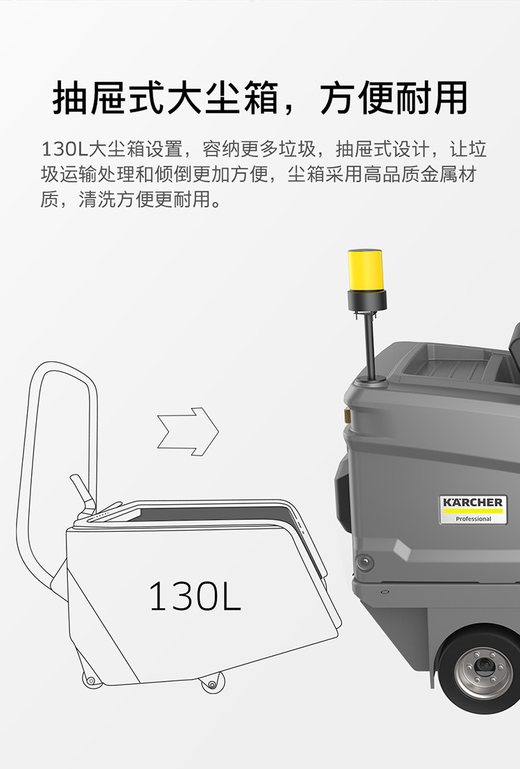 130L大塵箱配置,容納更多垃圾,抽屜式設(shè)計,讓垃圾運輸處理和傾倒更加方 便,塵箱采用高品質(zhì)金屬材質(zhì),清洗更方便,耐用。