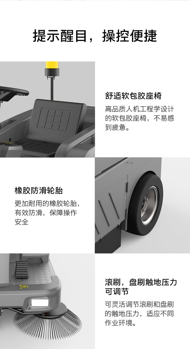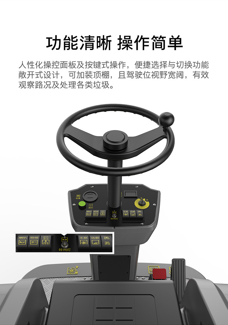 敞開式設(shè)計,可加裝頂棚,駕駛式視野極佳,可以有效判斷路口,觀察處理各種 地面垃圾。按鍵式操控按鈕,讓功能選擇和切換都非常簡單,讓清潔更加輕松, 舒適。