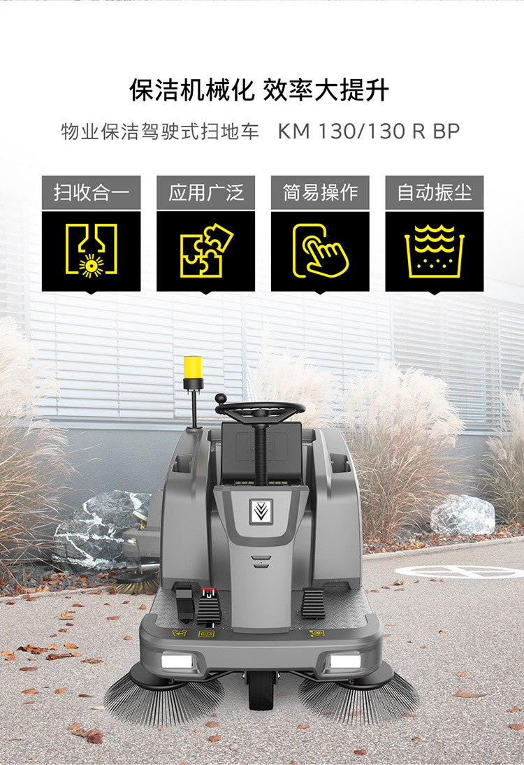 卡赫高品質(zhì)商業(yè)級駕駛式掃地車,清潔寬度1,300mm,每小時可高效清潔7,000㎡以上的地面,告別傳統(tǒng),有效替代30人以上的人工,可有效清潔瀝青,水泥,砂石,毛石等洗地機(jī)無法清洗的地面。
